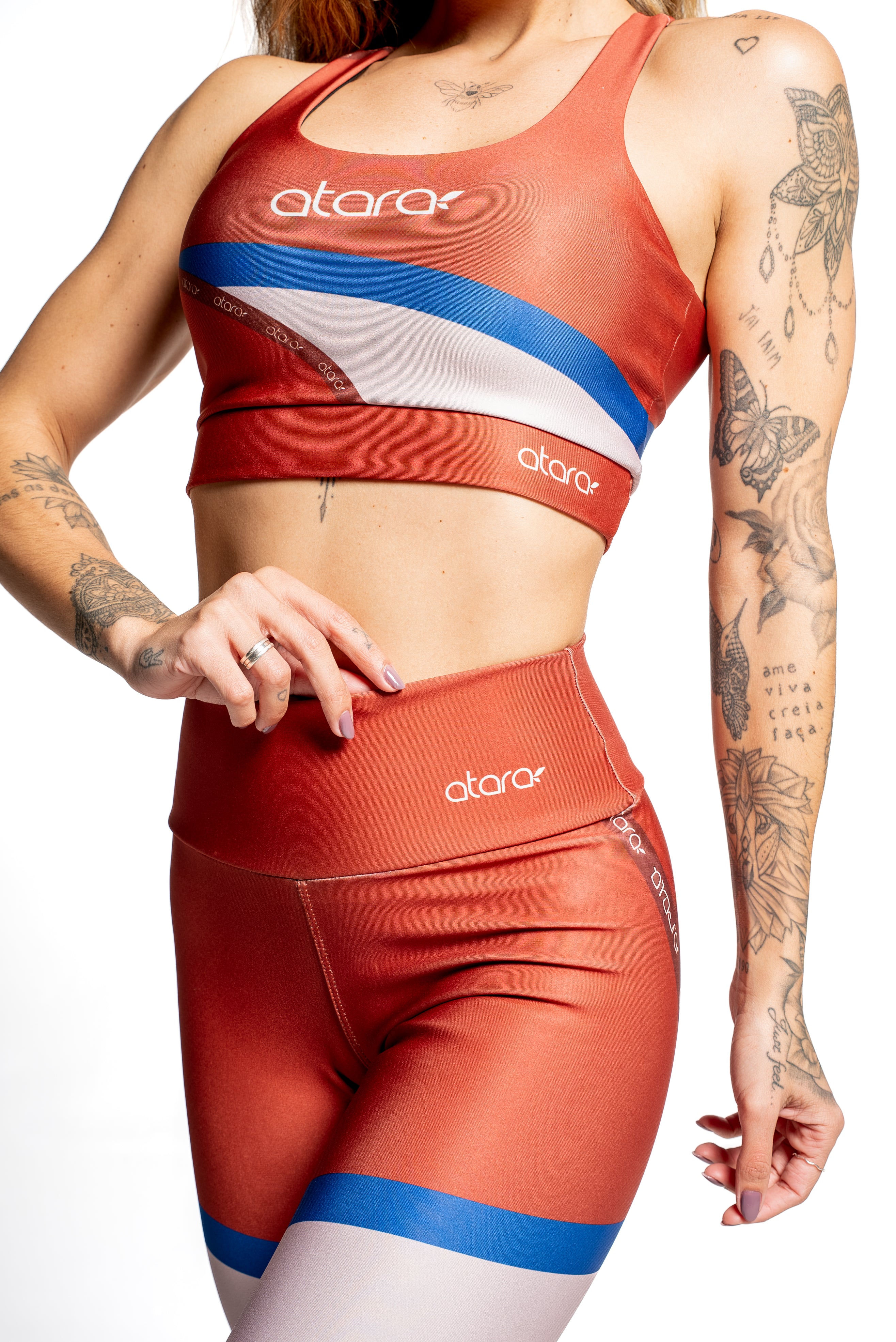 - Parte Externa em Poliéster: A parte externa em poliéster permite a aplicação de cores vibrantes e detalhadas, adicionando um toque especial de estilo ao seu look fitness.